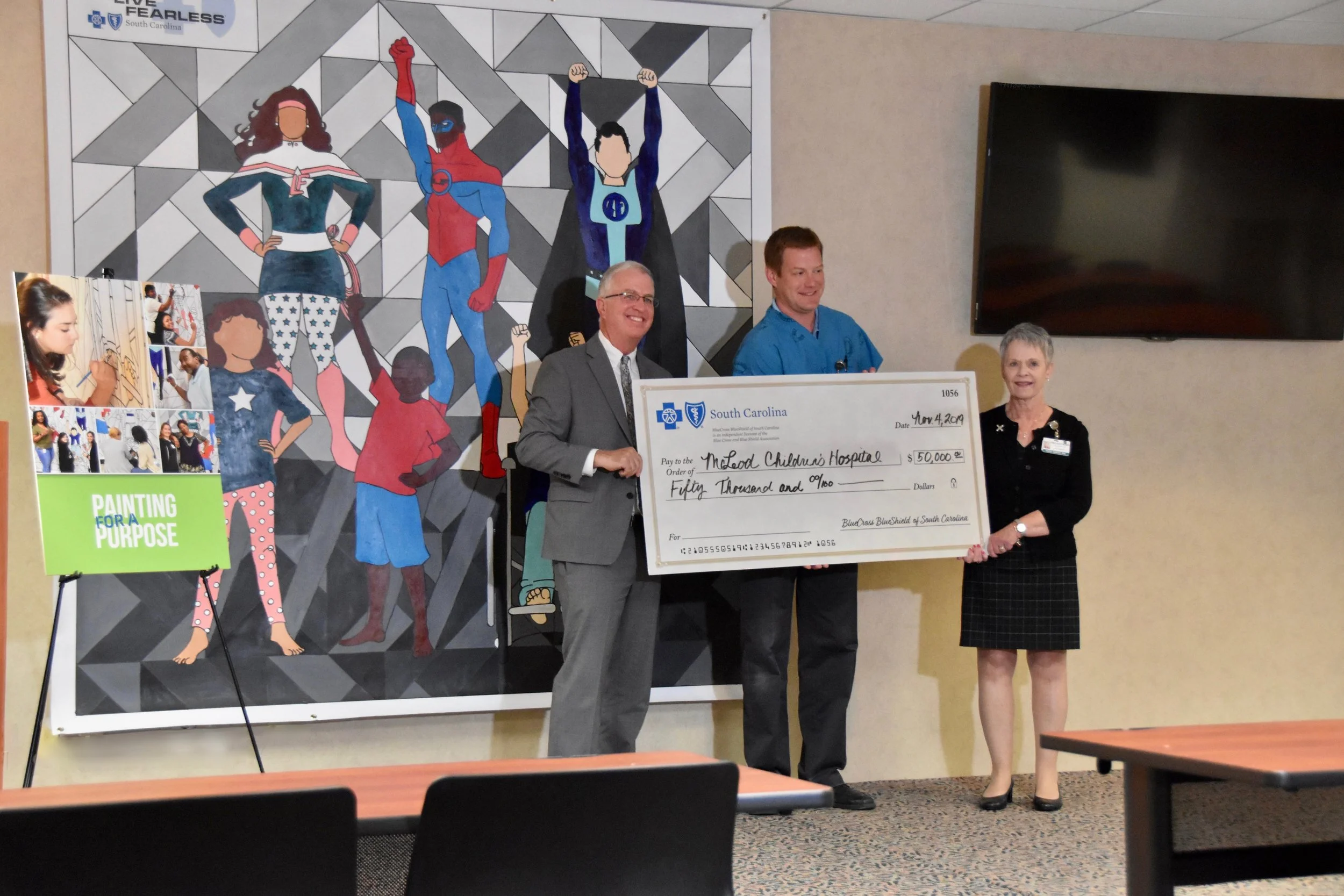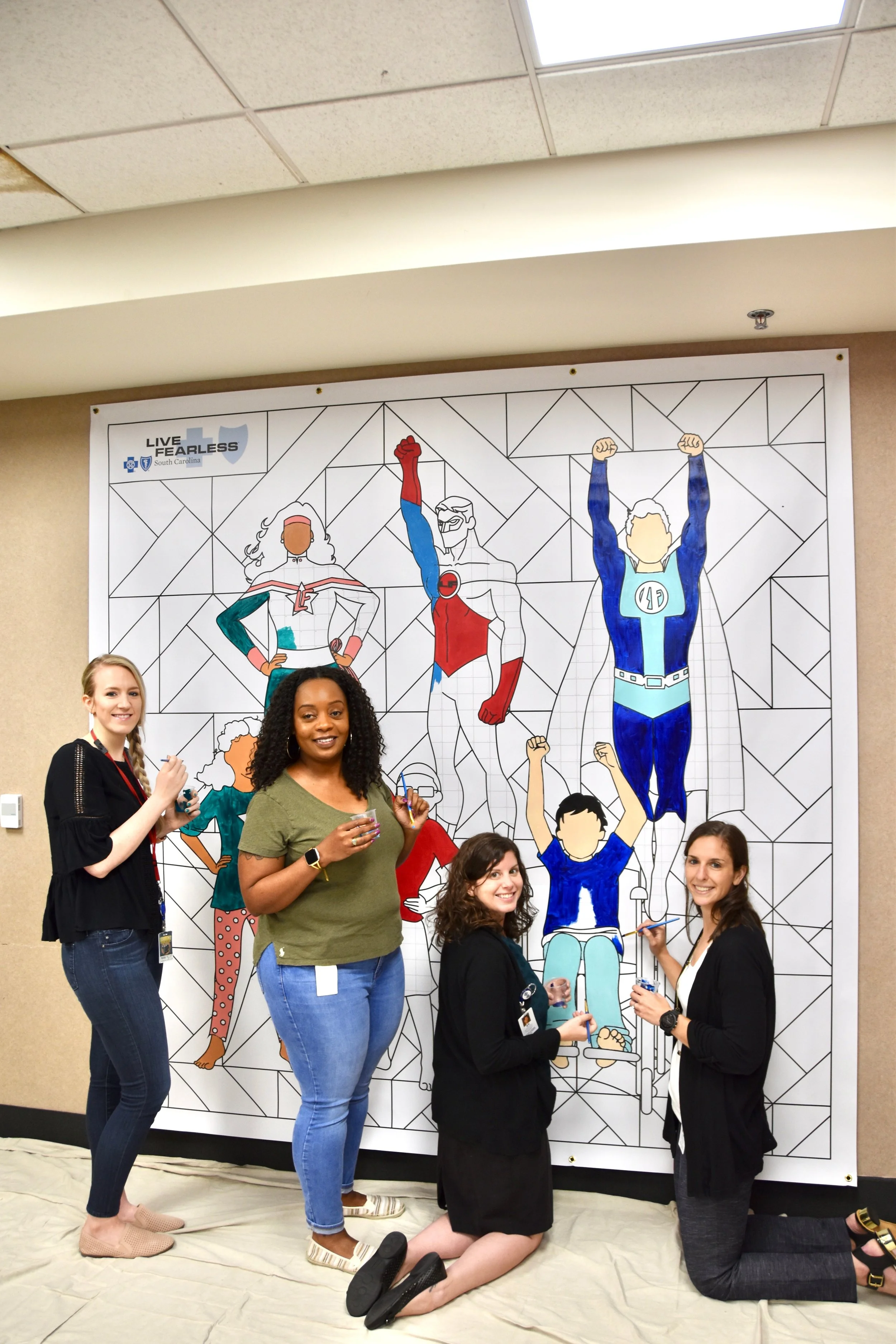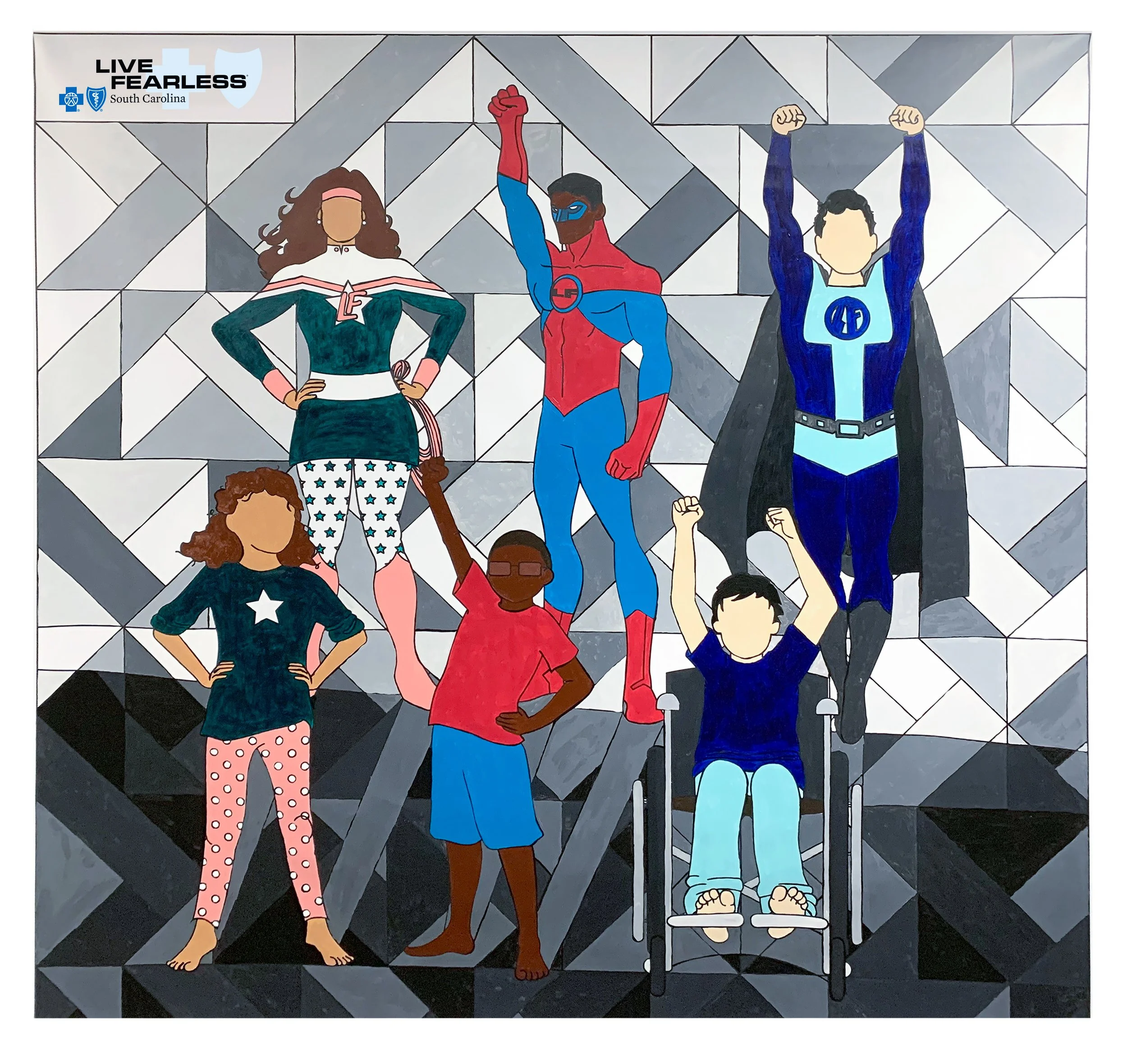 Laura illustrated, designed and oversaw the execution of the “Superhero” mural. It was painted, paint-by-numbers style, by employees; the final mural was gifted to McLeod Children’s Hospital.